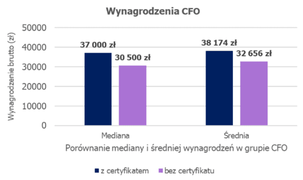 - Mediana wynagrodzenia dla osoby na stanowisku CFO z certyfikatem zawodowym wynosi 37 000 zł, podczas gdy dyrektorzy finansowi nie posiadający certyfikatu zarabiają o 21,3% mniej (30 500 zł)